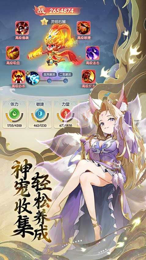 1、此外玩家还可以搭配实力阵容,进行养成,并且游戏中的神宠展现了精致特效,让玩家能够养心养身。