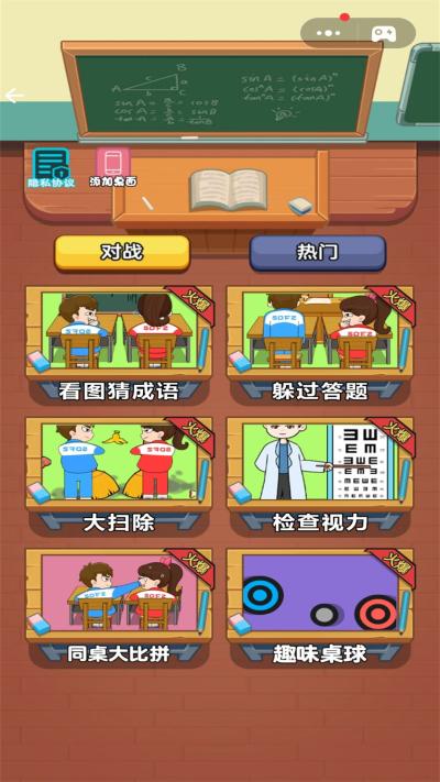 双人游戏大作战是一款代入感超强的双人实时对抗(PK)产品。两名同桌玩家将扮演对方的亲密同桌,并在紧锣密鼓的教学红蓝大作战中,进行一场关乎尊严的手速双人之战。整个对抗过程中,玩家不仅要竭尽全力地爆发手速,更要时刻小心老师的回眸,与班主任的凝视。是在安全的范围细水长流,还是在危险的边缘疯狂试探,都将有玩家自己决定。在这个简洁明了却又包罗万象的玩法下,玩家还将重温到123木头人、打手心、击鼓传花等情怀魅力。现在就回归到激情燃烧的青葱岁月,来一场紧张刺激的手速对决吧。