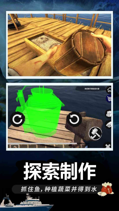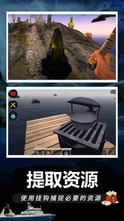 游戏的玩法主要围绕生存与创造展开。玩家在游戏开始时,只有一只小木筏和一根钩子,钩子可以用来收集漂浮在海面上的资源。随着游戏的进行,玩家需要通过收集材料,逐步扩大木筏的面积,增加生存空间。在此过程中,玩家还需要注意身体的饥饿和口渴状态,及时获取食物和水源。游戏中有多种食物可供选择,如鱼、椰子等,玩家可以通过钓鱼或种植来获取食物。玩家需要建造水过滤器和烹饪设备,以确保能持续获取水和食物。除了生存,玩家还可以通过制作工具和武器来保护自己,抵御鲨鱼的攻击。为了更好地适应环境,玩家可以探索海洋深处,寻找更多的资源和秘密,增加生存的乐趣。