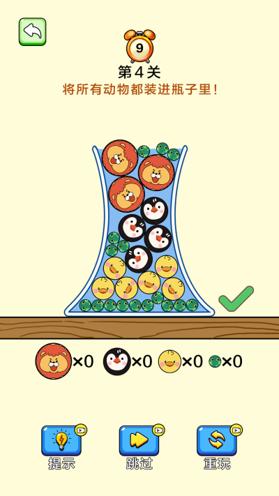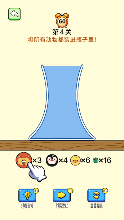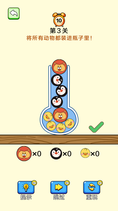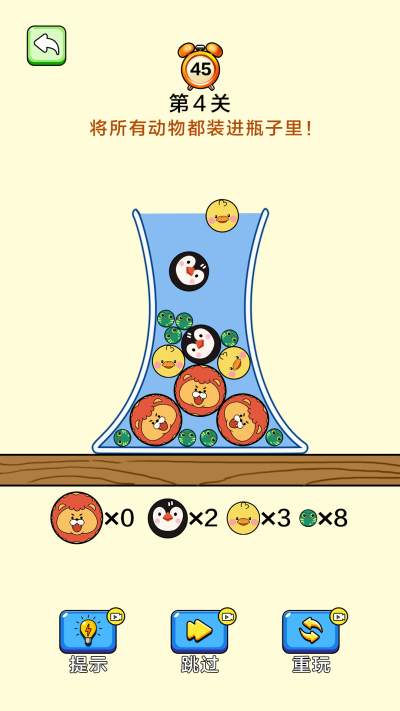 疯狂装瓶子是一款创意十足的休闲游戏,玩家的目标是将不同形状和大小的小球放入瓶子中。游戏中有丰富多彩的动物形象,玩家可以在轻松愉快的氛围中享受游戏的乐趣。每个关卡都有独特的挑战,玩家需要运用自己的智慧和技巧,灵活地将小球放入瓶子,体验到成功的快感。