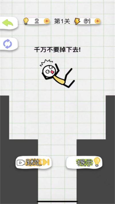 这款游戏的最大亮点在于其独特的画线机制,玩家可以自由发挥创意,画出各种形状的线条来完成任务。游戏不仅考验玩家的绘画能力,更考验逻辑思维和反应能力。每一关都有不同的挑战,保护火柴人不被掉落的物体砸中,或是引导火柴人走向安全区域,玩家需要灵活应对。游戏还设置了丰富的关卡和多样的场景,带给玩家新鲜感和持续的挑战,确保每一次游戏体验都不一样。