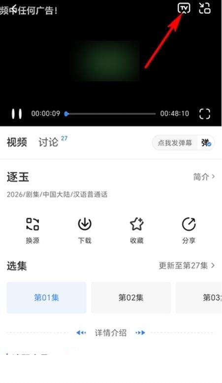 3、最后进入播放界面,点击右上角【tv】图标,链接设备投屏即可