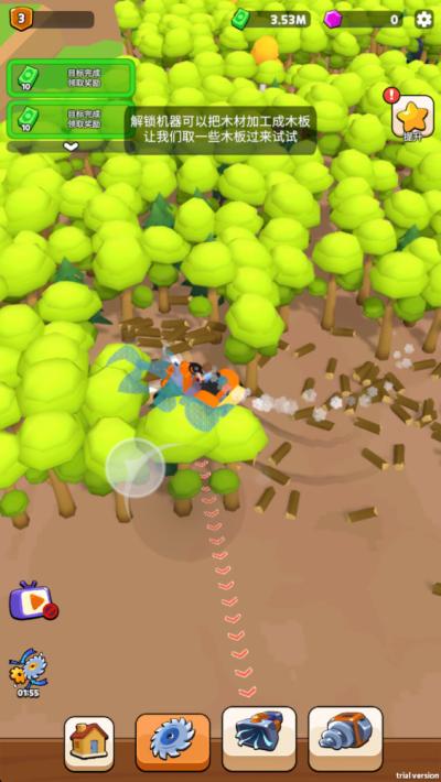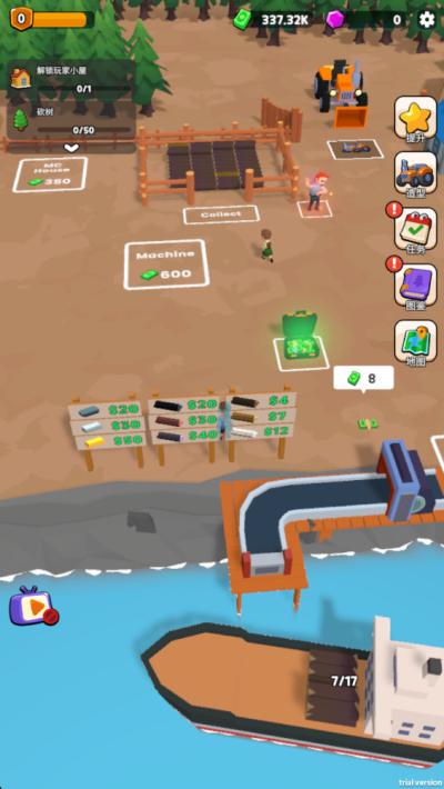 伐木帝国的操作直观易上手,但玩法策略却十分深邃。在基础操作层面,玩家通过点击屏幕即可指挥指定角色或工具进行砍伐、建造等动作,通过滑动屏幕则可以方便地规划连续砍伐路线、拖动资源或框选区域进行批量操作。这种简洁明了的控制方式,确保了新手玩家能够快速融入游戏,将注意力集中在更重要的战略决策上。
