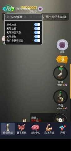 解锁与升级系统:在资源面板中,玩家可以浏览一个完整的人体构造图谱。从最初的单细胞状态开始,使用积累的细胞逐步解锁下一级部件,如基础细胞群、原始骨架。每解锁一个部件后,还可以继续投入细胞对其进行升级,提升该部件的效能或为后续更高级部件的解锁提供加成。升级骨骼系统可能会增加细胞产出速度,或降低解锁肌肉附着点所需的成本。