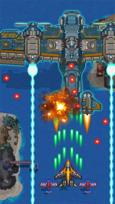 游戏的操作直观而精准,采用了移动端经典的虚拟摇杆+自动射击设定。屏幕左侧的虚拟摇杆负责控制战机的全方位移动,手感顺滑,响应迅速。战机默认自动发射主武器,玩家可以将全部注意力集中在躲避和走位上。核心玩法循环清晰明了:在关卡中,玩家需要操控战机在密集的敌机与弹幕中生存下来,并消灭所有敌人。面对普通敌机时,需要快速清理以打开安全通道;面对精英敌机时,则需观察其攻击模式,针对性击破。战斗中,击落敌机会随机掉落金币、血包、护盾或强力临时武器(如激光、散射弹等),合理拾取这些道具是通关的关键。面对最终的关卡BOSS时,玩法升级为策略性阶段战斗。玩家必须熟悉BOSS每个阶段的攻击模式:第一阶段通常需要破坏其外部装甲,清理不断出现的小型敌机;第二阶段BOSS可能会暴露核心或召唤更多随从;最终阶段,BOSS往往会进入狂暴状态,释放覆盖大部分屏幕的毁灭性技能,此时需要利用之前积累的护盾或极限操作进行躲避,并抓住短暂的安全窗口进行反击。整个游戏过程考验的是玩家的反应速度、局势判断能力和持久作战的耐心。