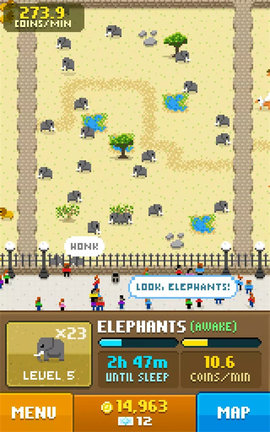 迪斯科动物园拥有诸多令人印象深刻的特色。首先是其极具感染力的视听表现。游戏画面采用NimbleBit标志性的精致像素风格,色彩明快,动物造型可爱又富有特色。而当玩家启动迪斯科派对时,整个游戏体验将达到高潮:欢快的复古迪斯科音乐瞬间响起,园内所有动物和游客都会开始摇摆跳舞,画面变得流光溢彩,金币产出效率直接翻倍,会重置所有动物的休眠倒计时。这个设计不仅带来了视觉和听觉的双重享受,更是游戏内关键的收入爆发点和管理优化手段。是深度的成长与收集系统。同一种动物的数量可以累积,达到一定数量后即可升级,升级后的动物金币产出效率更高。不同稀有度的动物拥有不同的等级上限,神秘动物往往拥有更长的持续工作时间,激励玩家不断探索以获取它们。是充满惊喜的随机事件系统。在经营过程中,可能会遇到动物越狱到其他展区串门、神秘的商人提出高价收购你的某只动物、或是特殊的限时挑战任务等。这些事件让平静的园区经营时刻充满了新鲜感和不确定性。