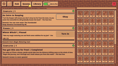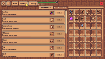 游戏的玩法流程清晰而富有层次。初入游戏,玩家将通过简单的任务引导熟悉基本操作,在【Quests】界面接取任务,并利用【PINNED】功能追踪目标。核心的互动集中于主界面:点击【Begin Farming】,Caleb便会开始自动执行包括浇水、收集、战斗在内的一系列冒险行为。当遇到NPC时,与之互动【MEET】可以接取到各种剧情或资源收集任务,帮助村民收集木材。玩家需要根据任务要求,引导Caleb进入相应场景(如点击【Enter Woods】进入森林砍树)。任务完成后,进度条会变为绿色,提交即可获得奖励。整个过程中,玩家的核心职责并非微观操控,而是宏观管理——在Caleb自动冒险的持续关注其装备状态,利用收集到的资源进行锻造和卡牌炼金,研究卡牌之间的连锁效应,逐步构建并优化属于自己的最强流派,以应对愈发艰险的挑战。