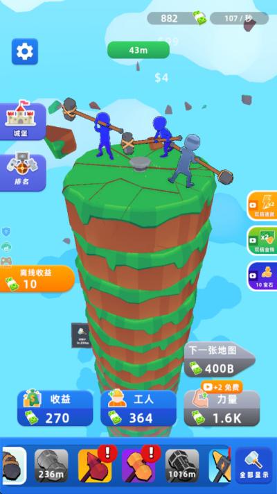 锤子小队的玩法流程清晰且富有层次,主要可以分为四个阶段:开拓、招募、强化与攻坚。开局后,玩家首先需要关注地图上标有【免费】字样的格子,点击【建造】按钮,这是开启新区域、扩大操作空间的基础步骤,为后续的消除和资源收集打下坚实基础。在积累了一定初始资金(钞票)后,玩法进入核心阶段——组建您的锤子小队。点击【工人】图标,通过【消耗钞票】来雇佣更多工人。工人是您破坏柱子的直接执行者,初期增加工人数量能显著提升破坏效率,加快通关进度。当拥有多名相同等级的工人时,游戏的深度养成环节便开启了:找到这些相同的小人,点击【合并】按钮(通常需消耗400钞票),可以将他们合成一个更高级、力量更强的工人。合并是强化团队核心战斗力的主要途径,能让破坏柱子的速度产生质的飞跃。当您的团队经过建设和培养足够强大,资源也充分积累(达到【3.84K】的收益)时,就可以指挥小队对目标柱子发起总攻。在合力破坏柱子的过程中,每一次锤击都会带来钞票的增长,这种即时的正反馈让攻坚过程充满成就感。整个玩法环环相扣,要求玩家在消除获取资源、经营壮大队伍、制定破坏策略之间做出最佳平衡。