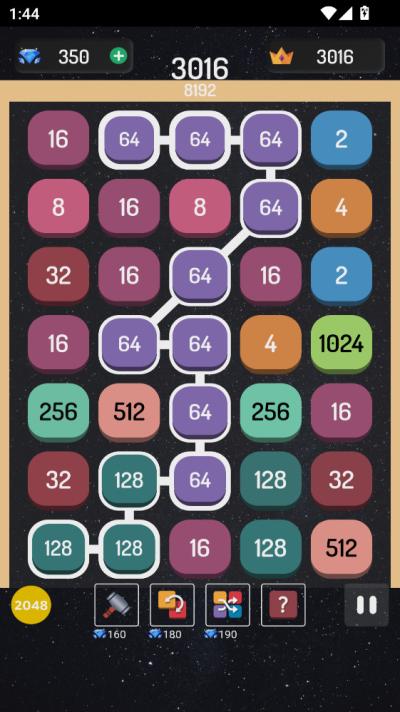游戏的玩法流程清晰而富有策略性。开局后,棋盘上会随机分布基础数字方块。玩家的核心操作正如前文所述:观察棋盘,寻找数值相同的方块,手指滑动连接它们。规则虽简单——两个相同数字即可相加——但精髓在于如何高效地执行。在连接时,路径可以穿越其他方块,只要起点和终点是相同数字即可,这为长距离、多目标的连接创造了条件。当成功将多个相同数字(如三个或四个4)合并在一起时,将直接生成一个更高阶的数字(如一个16),这比多次两两合并效率高得多。游戏鼓励玩家不断探索和尝试,通过持续合并来获取尽可能高的数字。随着棋盘空间被不断合成出来的大数字占据,挑战也随之升级,需要玩家更谨慎地规划每一步,平衡创造空间与提升数字两者之间的关系,有时甚至需要为了长远的连锁效应而做出暂时的牺牲。