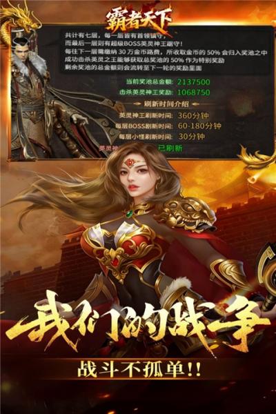霸者天下是一款既尊重经典又敢于创新的传奇手游。它以六大职业开启全新战局,用刀刀爆装的爽快感点燃热血,凭借丰富多样的特色系统和持续更新的内容,为所有玩家提供了一个充满机遇、战斗与兄弟情义的宏大世界。玛法大陆的战火已经重燃,王座虚位以待,你准备好前来书写属于自己的霸者传奇了吗?