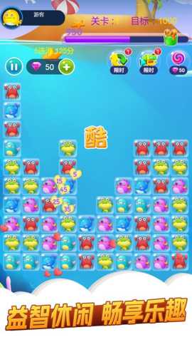 萌萌消一消是一款以海洋世界为背景的经典三消益智游戏。游戏的核心舞台是一个充满奇幻色彩的深海王国,这里居住着形态各异、憨态可掬的海洋居民:有身披彩虹鳞片、游弋自如的热带鱼,有举着大钳子、横着走的俏皮螃蟹,还有鼓着腮帮子、眼睛圆溜溜的活泼青蛙。玩家的使命就是成为这个奇妙世界的秩序维护者,通过指尖的滑动与连接,将三个或以上相同的海洋生物连成一线,看着它们欢快地消失,从而清理关卡图板,完成各式各样的目标任务。游戏画面精致细腻,色彩运用明亮柔和,每一只小动物都被刻画得栩栩如生,搭配上轻松悦耳的背景音乐与清脆的消除音效,共同营造出一个令人心旷神怡的游戏环境,让玩家仿佛置身于真实的海洋乐园之中。