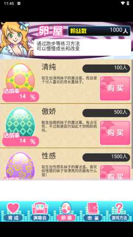 育成偶像之卵的核心设定充满创意与幻想色彩。游戏世界中,潜在的偶像并非以寻常方式诞生,而是蕴藏在一颗颗神秘的偶像之卵中。作为玩家,你将成为一家偶像事务所的负责人,核心工作就是通过孵化这些卵,发掘并培养拥有不同特质与潜力的少女。从清纯活力的女高中生、神秘内向的室内装少女,到设定独特、充满故事感的超短裙人妻警察,每一位角色都拥有其初始的个性与背景。游戏的养成体系设计得深度且完善,你需全面介入偶像的成长周期:从基础的课程训练、属性提升,到风格定位、公众形象塑造,乃至复杂的行程安排与资源管理。每一个决策都将影响偶像的发展轨迹与最终高度,目标是将她们从默默无闻的练习生,打造为聚光灯下万众瞩目、拥有庞大粉丝群的顶级偶像。