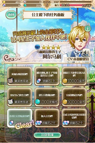 梦王国与沉睡的100王子拥有诸多独具匠心的特色系统。其一是深度的角色养成与羁绊系统。每位王子都拥有精美的卡面,通过战斗与剧情推进可以提升王子等级、进行觉醒突破形态,解锁更华丽的卡面与更强大的能力。通过赠送礼物、完成特定任务、阅读羁绊故事,可以不断提升与王子之间的亲密度,解锁专属的私人剧情、语音和背景,让你全方位了解心仪王子的方方面面,感受情感逐渐升温的过程。其二是策略多变的战斗系统。游戏采用色彩消除作为核心战斗方式,但绝非无脑消除那么简单。王子们分为红、蓝、绿、黄、紫五种属性,存在相互克制关系。玩家需要根据关卡敌人的属性,巧妙搭配同色纯色队或兼容并蓄的杂色队,并合理运用王子们各不相同的主动技能(如转换宝石颜色、消除特定区域宝石、回复生命值、延长战斗时间等)来克敌制胜。这种结合了角色养成、属性克制与即时策略的玩法,使得每一场战斗都充满挑战性与趣味性。
