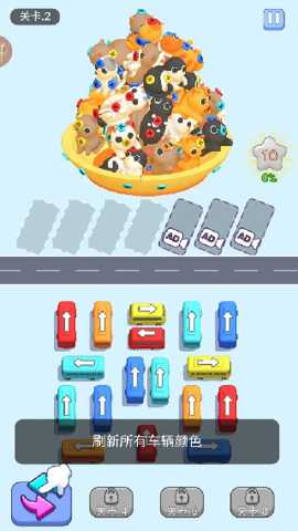 游戏的玩法核心清晰聚焦于规划与执行。每一关开始,玩家会面对一个停满了各种颜色小汽车的停车场,而数辆同色的大巴士则被堵在深处。玩家的目标就是:通过移动(拖拽)这些小汽车,最终让所有同色巴士前方道路畅通,能够顺利驶向对应的站台。移动规则通常允许车辆在空位上前后左右滑动,但必须遵循物理空间限制,不能跳跃或穿越其他车辆。这就意味着,每一步移动都可能打开新的通道,也可能堵死关键的出路,**前瞻性规划**至关重要。优秀的玩家会像下棋一样,在脑海中预演未来三四步甚至更远的局面。当遇到看似无解的死胡游戏提供的洗牌道具可以随机重置部分车辆的位置,带来破局的新希望。整个过程是对玩家观察力、空间想象力和逻辑排序能力的综合考验,每一次成功为巴士开辟出道路,都会带来无与伦比的成就感。