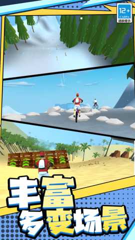 游戏的玩法层次丰富,远不止于从A点到B点的简单冲刺。其核心玩法可以概括为收集、改装、竞速、特技四位一体。在深度改装系统中,玩家可以利用收集的金币解锁并拥有超过50款造型、性能各异的自行车,从轻盈的公路赛车到坚固的山地霸主,应有尽有。这仅仅是开始,你还可以对爱车进行从车架、轮胎到传动系统的全方位性能调校,通过轻量化提升加速,或强化悬挂以应对复杂地形。最令人热血沸腾的莫过于加装氮气加速装置,在直道或关键时刻启动,享受瞬间爆发的推背感,实现惊天逆转。而游戏的特技系统则为竞速增添了华丽的表演色彩。在面对跳跃坡道时,抓住时机做出空中翻滚、撒手等炫酷特技,不仅能赢得满堂喝彩与额外积分,一次完美的落地更能触发速度加成,将观赏性与实用性完美结合,让竞速过程既紧张又赏心悦目。