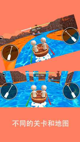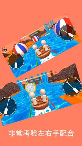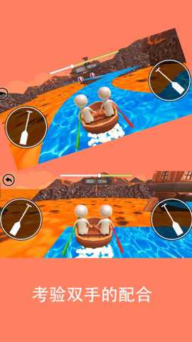 游戏玩法围绕着双人协同操作的核心展开。每名玩家分别控制位于小船左侧或右侧的船桨,通过有节奏地向后划动屏幕来提供动力。前进的关键在于同步:当左右桨、同力度向后划时,船只笔直向前;若只有单侧划动,船只则会向另一侧转向。想要直线加速、平稳过弯或紧急避障,都需要双方通过语言、眼神或纯粹的默契来协调左划、右划或停的指令。在关卡进程中,玩家需要共同规划路线,避开固定障碍如木桩、石桥,应对动态威胁如来回摆动的巨锤、间歇喷发的泉水。某些高级关卡还引入了合作解谜元素,需要一人暂时稳住船身,另一人触发机关打开水道闸门。成功抵达终点后,系统会根据用时、配合度和收集物完成情况给予评价,激励玩家追求更高水平的协作。整个游戏过程就像一场生动的水上沟通课,在不断的尝试、失败、大笑与成功中,玩家能深刻体会到同心协力的真正含义。
