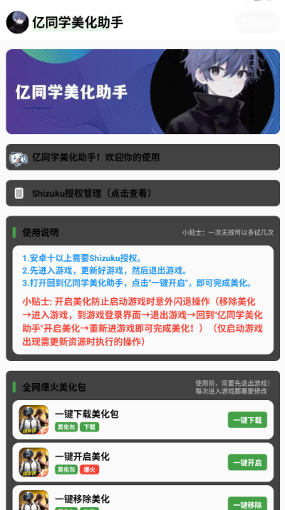 在移动游戏体验日益追求沉浸感与视觉冲击的今天,设备性能与游戏画质之间的平衡成为许多玩家面临的现实挑战。尤其对于和平精英这类对画面细节和操作流畅度要求极高的竞技手游,如何在有限的硬件条件下解锁更佳视觉表现,是广大玩家群体的核心诉求。正是在的背景下,亿同学美化助手应运而生,它不仅仅是一个简单的参数调节工具,更是一款为手游玩家提供全方位视觉优化与个性化定制体验的智能助手。通过深度整合画质增强、资源管理与视觉美化功能,它帮助每一位用户发掘设备潜能,打造独一无二的游戏视界。