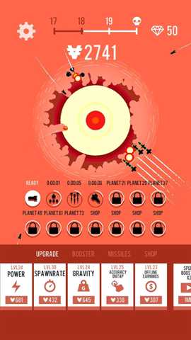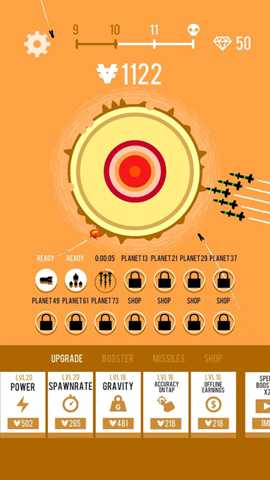游戏的玩法核心围绕选择-瞄准-轰炸的循环展开,但蕴含着丰富的策略与变化。玩家进入一个星域后,首先需要从武器库中选择本次出击要使用的导弹类型。游戏提供了多种导弹,:范围广阔的散射导弹、伤害穿透的激光导弹、造成持续燃烧的等离子导弹以及拥有华丽全屏效果的末日导弹等。每种导弹都有其适用的场景,面对结构松散的小行星带,范围攻击效率更高;而面对拥有坚固核心的巨型星球,则可能需要高单发伤害的导弹。选择好武器后,玩家需操控轰炸机飞行,调整角度和位置,抓住最佳时机发射导弹。成功摧毁星球后,玩家会获得金币、钻石等奖励,并解锁通往下一个星域的通道。随着进程深入,还会出现带有特殊护盾、需要多次攻击或利用环境才能摧毁的挑战性星球,为游戏增添了更多的趣味性和策略深度。游戏还巧妙地融入了放置元素,即使离线,玩家的基地也会自动生产部分资源,让再次上线时总能有所收获,兼顾了轻松休闲与持续成长的体验。