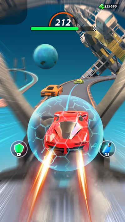 立体赛道:跨越维度的驾驶挑战。 赛道设计彻底打破了二维平面的限制。你需要驾驶赛车在摩天大楼间穿梭、沿巨大的环形管道翻滚、从悬浮平台飞跃至另一平台。这种三维立体的赛道布局,要求玩家必须具备极强的空间感知能力和瞬间决策能力。