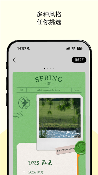 排版小动物的玩法轻松而富有条理,主要围绕记录、排版、收集三个核心环节展开。玩法第一步是灵感记录:点击主界面右上角的笔形图标,进入创作页面。用户可以自由填写卡片标题和详细内容,并可以从相册上传一张或多张图片来丰富卡片的视觉元素。完成后,点击写好了进入下一阶段。玩法第二步是萌宠排版:这是最具趣味性的环节。界面会展示所有可用的小动物排版师及其预览图,用户可以根据文字内容的情感基调或个人喜好,选择一位小动物。选定后,还可以进一步在该动物提供的多款细化模板中进行选择,预览不同排版效果。确认后点击排好了,系统便会瞬间生成最终的精美卡片。玩法第三步是归档收藏:生成的卡片会自动保存在你所选小动物的专属纸箱中。用户可以随时进入文件箱界面,查看所有小动物的纸箱,点击即可浏览该分类下的所有历史卡片,形成清晰有序的个人记录博物馆。整个流程丝滑流畅,将创作与管理的乐趣完美结合。