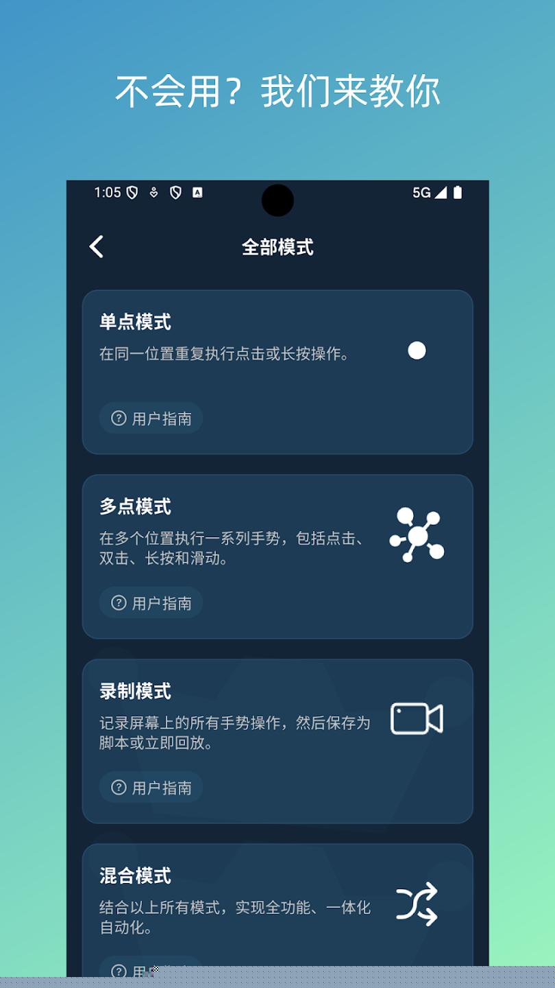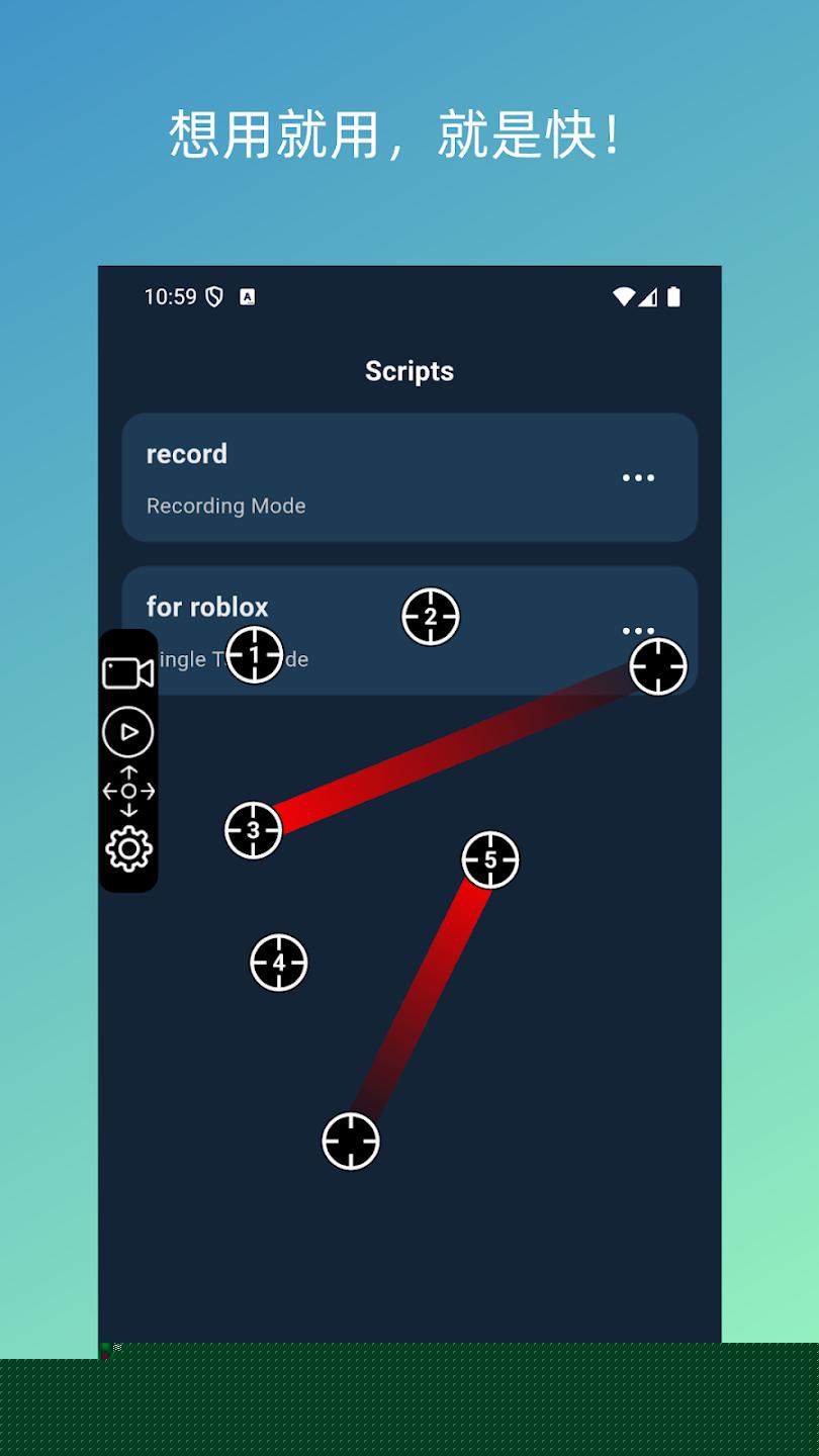 1. 全场景手势模拟,告别单一点击: 此功能解决了用户需要模拟复杂交互行为的需求,支持在屏幕上设置多个独立的点击目标,每个点都可单独配置点击延迟、触摸时长和重复次数,实现多点同步或异步操作,突破了点击的局限,能够模拟单指或多指的直线滑动、自定义曲线轨迹滑动,以及设定时长的长按操作。无论是短视频应用的连续上翻、地图App的双指缩放,还是游戏中的复杂走位,都能精准还原。其独有的手势录制功能,允许用户直接在屏幕上操作一遍,软件便能自动捕捉并生成可重复执行的脚本,将任何手动流程一键转化为自动化任务,极大简化了脚本创建过程。