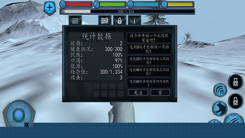 游戏的玩法围绕生存模拟与世界探索两大支柱展开。进入游戏后,玩家首先需掌握基础生存技能:捕猎以获取食物、寻找水源、在恶劣天气中寻找庇护所。不同的动物捕猎方式迥异,需要玩家学习并熟练运用。核心玩法驱动来自一系列任务系统,包括主线生存挑战、照顾家庭的家园任务以及探索特定区域的发现任务。战斗系统则提供了紧张刺激的对抗体验,面对狼群或其他顶级掠食者时,需要运用策略、利用环境进行周旋或正面交锋。自由探索是游戏的巨大乐趣来源。攀上雪山之巅俯瞰冰原,潜入冰海追踪鱼群,每一个角落都可能藏着意想不到的惊喜或资源。游戏巧妙地将任务目标、环境挑战与角色养成结合在一起,确保了游戏进程始终充满目标感和新鲜感。