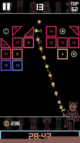 BBTAN打砖块的亮点纷呈,首先便是其革命性的操作变革,将传统打砖块的即时反应考验,转化为富有策略深度的回合制瞄准。玩家只需在屏幕上拖拽,即可直观地调整发射角度与力度,松开手指,弹珠便会沿着预定轨迹飞出,在墙壁与砖块间进行多次反弹。这种设计不仅降低了操作门槛,更将游戏重心转向了预判与规划,每一次发射都充满了计算与期待。游戏的砖块设计独具匠心,每个砖块上都标有数字,代表需要被撞击的次数。玩家必须通过精准的反弹,累计撞击对应次数才能将其消除,这大大增加了游戏的策略维度,简单的打中升级为如何高效地多次击中。
