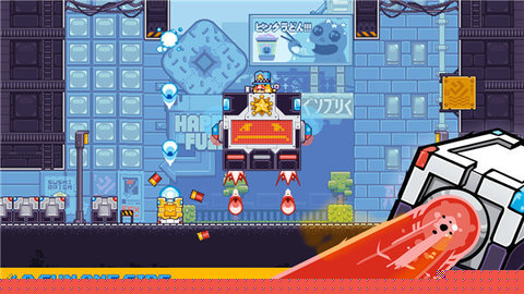 本作的特色极为鲜明,首当其冲的便是其颠覆性的角色设计。枪砖这一概念将武器、盾牌与载具完美融合于一个简单的几何形体中,创造了前所未有的操控体验。游戏强调简约而不简单的操作哲学。所有动作仅通过点击(发射子弹)和长按(持续发射/火箭跳)配合砖块自身的翻转来完成,但由此衍生出的移动技巧却博大精深。将枪面朝下对准地面长按发射,可以实施经典的火箭跳进行垂直攀升;将枪面对准侧方墙壁射击,则能利用反作用力实现贴墙横向平移。这种将攻击与位移深度绑定的设计,带来了极高的操作上限和成就感。再者,游戏的敌人种类丰富且特点鲜明,从近战突袭的持刀小混混,到远程攻击的疯狂变种人,再到规律巡逻的机械守卫,每种敌人都需要玩家采取不同的面位策略(用盾牌格挡或抢先开枪消灭)来应对,进一步丰富了战斗的层次感。