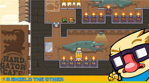 枪砖Gunbrick最新移动版本的亮点首先在于其无与伦比的一体双面核心机制。这块四四方方的砖块仅有相邻的两个面具备功能:枪面与盾面,这构成了所有策略与操作的基础。游戏拥有令人叫绝的物理引擎。子弹的后坐力不仅是攻击手段,更是移动、跳跃和解谜的关键动力。砖块的翻滚动量、落地反弹、重力影响都被模拟得真实而巧妙,使得每一次操作都充满变数与可能。第三,关卡设计堪称教科书级别。数十个精心设计的关卡层层递进,不断引入新的机关元素,如移动平台、周期性火焰喷射器、激光网格、压力板开关等,要求玩家必须灵活运用砖块的双面特性,结合物理规律进行思考与尝试。游戏充满了Nitrome特有的英式幽默感,无论是敌人滑稽的造型,还是失败时砖块狼狈翻滚的动画,都让紧张的冒险过程妙趣横生。