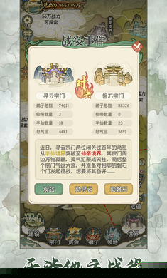 游戏的玩法层次丰富,兼顾了休闲与深度。在日常经营层面,玩家需要通过寻访、比试或触发机缘事件来招收拥有潜力的新弟子,并为他们分配合适的修炼功法、安排日常训练或生产任务,稳步提升宗门整体战力。在对外扩张层面,占领宗门周边的灵脉与稀有矿点是获取稳定灵气和炼器材料的关键,你需要审时度势,是讨伐弱小宗门以战养战,还是与周边大派缔结盟约以换取和平发展空间。在个人修行与宗门传承层面,游戏引入了功法残卷拼凑系统,玩家需在游历或探索中收集散落各地的残卷,方能解锁威力强大的高阶功法;参悟天道是突破境界上限的唯一途径,期间可能触发各种奇遇事件,瞬间改变宗门的发展走向。游戏操作轻松,适合利用碎片时间管理发展,但其在资源分配、弟子培养、外交战略上的决策又极具深度,保证了长久的可玩性。开发团队持续更新的仙界探索、虚空裂缝和资源争夺战等全新玩法,更是极大地拓展了游戏后期的内容与挑战。