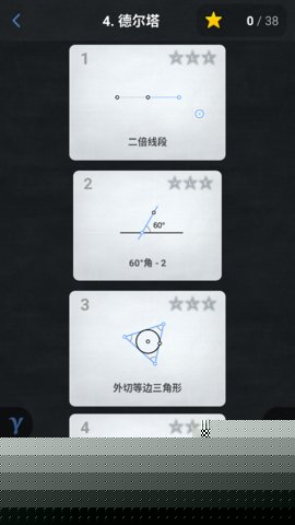 游戏的玩法流程清晰而富有层次。玩家在每一关中都会面对一个明确的几何目标(:过线外一点作垂线、构造一个36度角)。屏幕下方提供了基本的尺规工具(画直线、画圆、取交点等)。玩家需要通过一系列符合尺规作图公理的操作,从给定的初始图形出发,逐步构造出目标图形。随着关卡推进,玩家会解锁如角平分线、中垂线等复合工具(即之前关卡学会的构造)。玩法的高阶技巧在于策略性思考:面对难题时,可以逆向分析目标图形的几何构成,思考如何将其分解为已知的基本构造;在追求E值优化时,则需要暂时忘记便捷的快捷工具,回归圆规和直尺的最原始配合,设计巧妙的辅助线与交点,这往往需要创造性的灵感迸发。收集每一关的全部可能解法和达成最低E值以获得四星评价,为追求完美的玩家提供了持久的挑战动力。