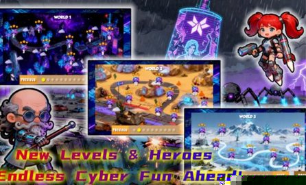 本作的亮点在于其超越传统塔防的多元策略深度与极具沉浸感的视听塑造。策略维度极为丰富巧妙融合了塔防布局、资源链管理、地形利用与英雄技能协同,要求玩家进行多线程思考。美术风格独树一帜,在赛博朋克的冷冽科技感与Q版的圆润亲和力之间找到了精妙的平衡,色彩运用大胆鲜明,每个角色和场景都拥有极高的辨识度。再者,游戏的数值成长曲线经过精心打磨,既保证了新手玩家能够平滑上手,体验步步为营的乐趣,也为追求极限的策略爱好者提供了极具深度的后期挑战与Build构建空间。由合成器浪潮风格打造的背景音乐,配合细节丰富的音效——从机械单位的低沉嗡鸣到能量武器充能时的尖锐嘶响,共同构筑了一个沉浸感十足的赛博朋克听觉世界。