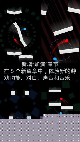 本作最显著的亮点在于其音画一体的沉浸式设计。游戏中的障碍物并非随机出现,其形态、运动轨迹和出现时机都严格遵循背景音乐的节拍、旋律乃至情感起伏。玩家实际上是在与音乐本身进行互动,游玩过程宛如一场精准的节奏舞蹈。当激昂的鼓点响起,障碍物的运动可能变得急促而密集;当旋律转入悠扬段落,通道则会呈现更富韵律感的波浪形态。这种深度绑定使得每首曲目都成为一个有待玩家演奏的独特乐器。另一个亮点是其极具张力的艺术表达。极简的黑白背景最大限度地突出了红蓝双球的运动轨迹,强烈的色彩对比提供了清晰无比的视觉反馈。这种冷静克制的视觉风格,与充满能量的电子音乐相结合,塑造出一种独特而迷人的未来主义美学氛围,让玩家能够完全沉浸在挑战之中,不受任何冗余信息的干扰。