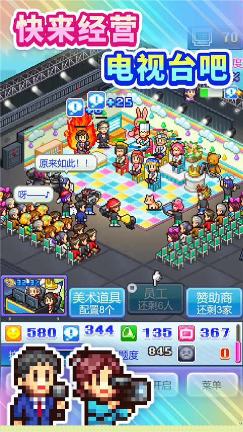 开拍电视制作物语是一款以电视台运营为核心的像素风格模拟经营手游。玩家将化身为一家新兴电视制作公司的掌门人,肩负起将这家小工作室发展成为业界巨头的重任。你的日常工作远不止按下录制键那么简单涵盖了电视节目生产的全产业链:从最初的市场调研与创意构思,到确定节目的主题与类型;从精心设计演播室的每一处布景装饰,到招募和培养专业的制作团队;从邀请风格各异的明星艺人参与录制,到最终将成品节目推向荧屏,接受观众收视率的残酷检验。游戏的核心目标非常明确:制作出脍炙人口的热门节目,不断提升公司的声誉与影响力,最终征服所有时间段的收视榜单,成为无人能及的电视行业霸主。