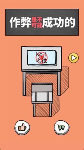 作弊是不可能成功的是一款游戏,打开窗子,摘掉外面的苹果。把苹果给墙上的乔布斯,我们就可以得到苹果里面的一条虫。把虫子喂给窗子外面的鸟,鸟飞走以后就可以得到一把钥匙。用钥匙打开柜子下面的第二个抽屉,得到一个吹风。用吹风去吹少的头发,就可以发现藏在里面的答案了。把墙角处的拖布收集起来,点击拖布,对墙上的画使用,然后拖布就只剩下一根棍子了。当不良少看答案时,用木棍把他的小抄打掉,就可以了。将透明被子套到红色杯子的外面,就可以看到上面的答案了。