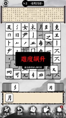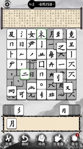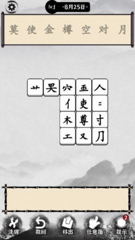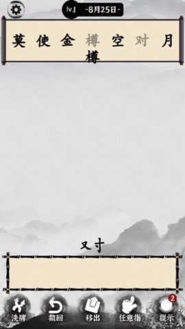3、开始时的关卡多为五言律诗,玩家需要在方块中寻找被拆分掉的文字,并将其合并填入诗词之中。