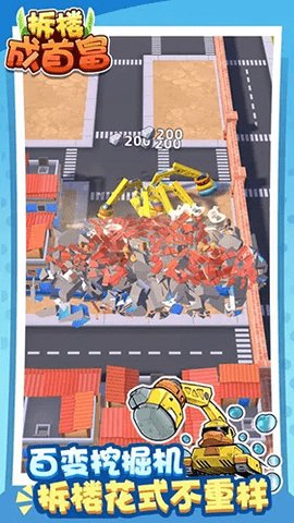 拆楼成首富最新版是一款游戏,玩家将经营一辆挖掘机开始你的拆房之旅。在这个游戏中,你需要拆除违建并将拆下来的石块送往加工厂进行加工,最终将其变成砖块。这些砖块将由搬运工运送到建筑队,用于建造摩天大楼。通过这样的方式,你可以赚取足够的钞票,打造出属于自己的商业帝国。