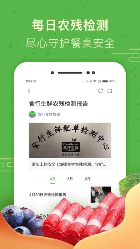 食行生鲜官网版是一款功能丰富的生鲜、买菜、配送、采购应用。每天,该软件会发布农产品的农残检测报告,以确保用户的饮食安全。
