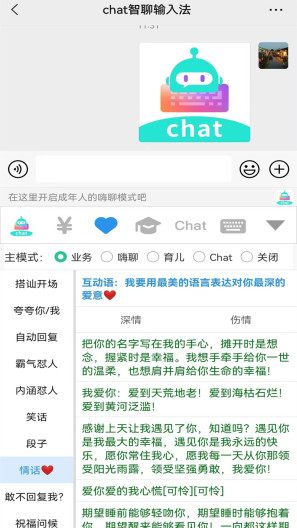 3、无论是不擅长搭讪和销售的用户,还是需要浪漫情话的用户,chat智聊输入法都能够满足他们的需求。