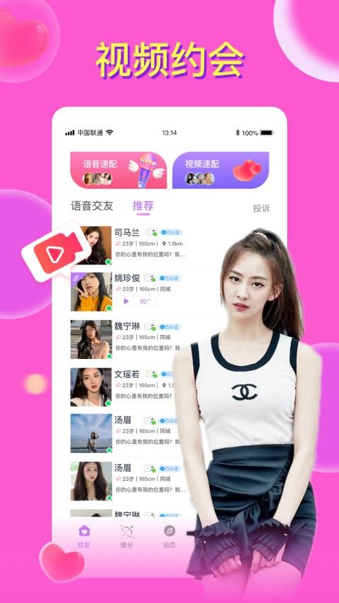 4、同城畅聊单身交友是一款聊天交友、语音视频为一体的软件,它能快速发现身边的有缘人,让用户一分钟拉近彼此之间的距离,随时认识周边靠谱的异性,实现零距离视频聊天约会。