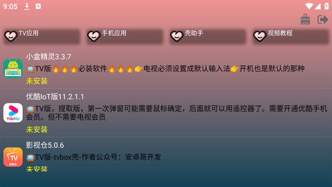 1、壳助手TV还是一个辅助工具,它支持下载本地包和推送配置线路,内置了多款优秀应用,用户可以一键下载安装手机版应用。