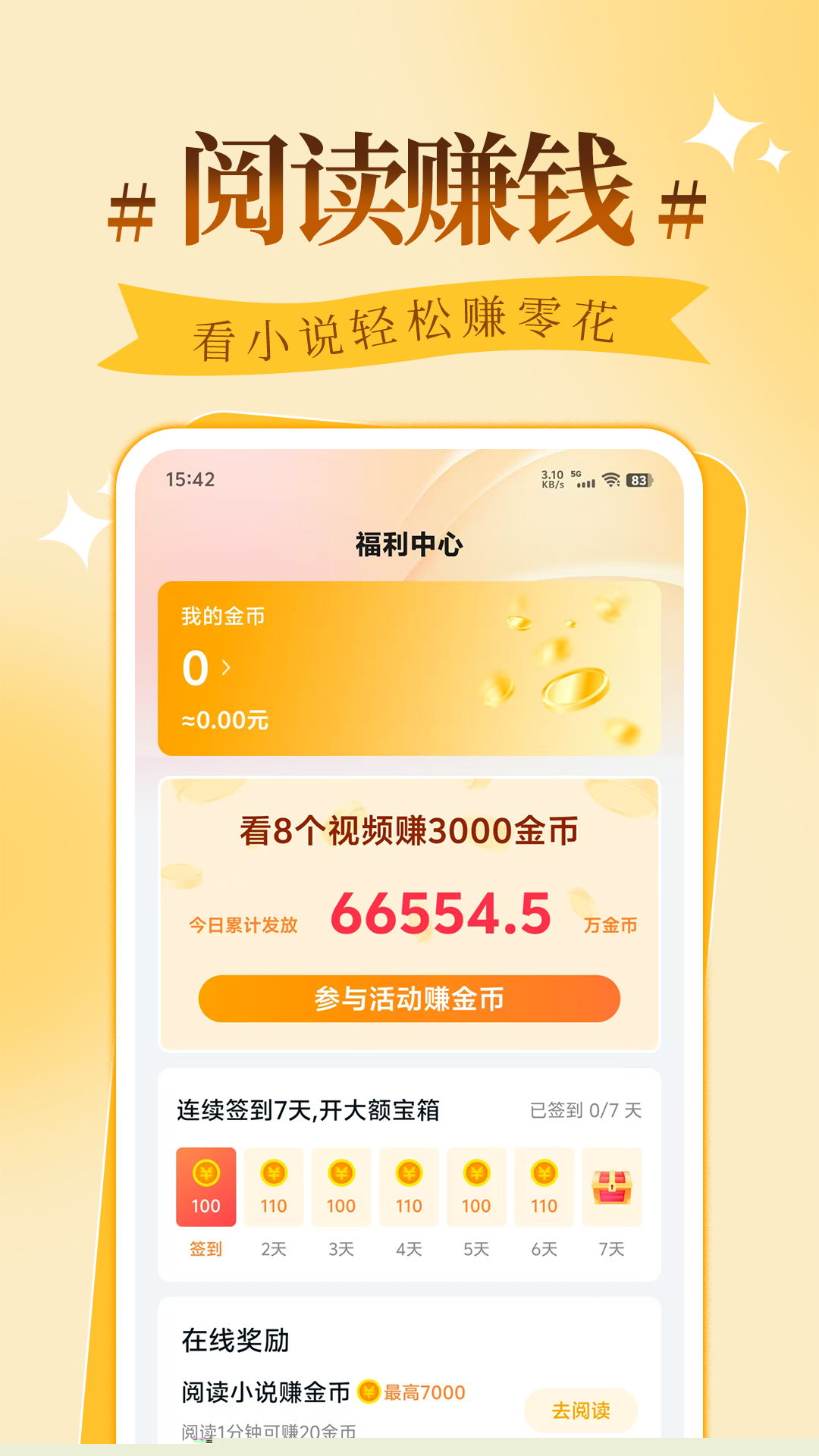 3. **金币福利,惊喜连连**:拾忆阅不仅是阅读的平台,还是一个可以赚取零花钱的地方。用户通过签到、阅读等方式可以获得金币奖励,参与各种活动领取福利,让阅读变得更加有趣。