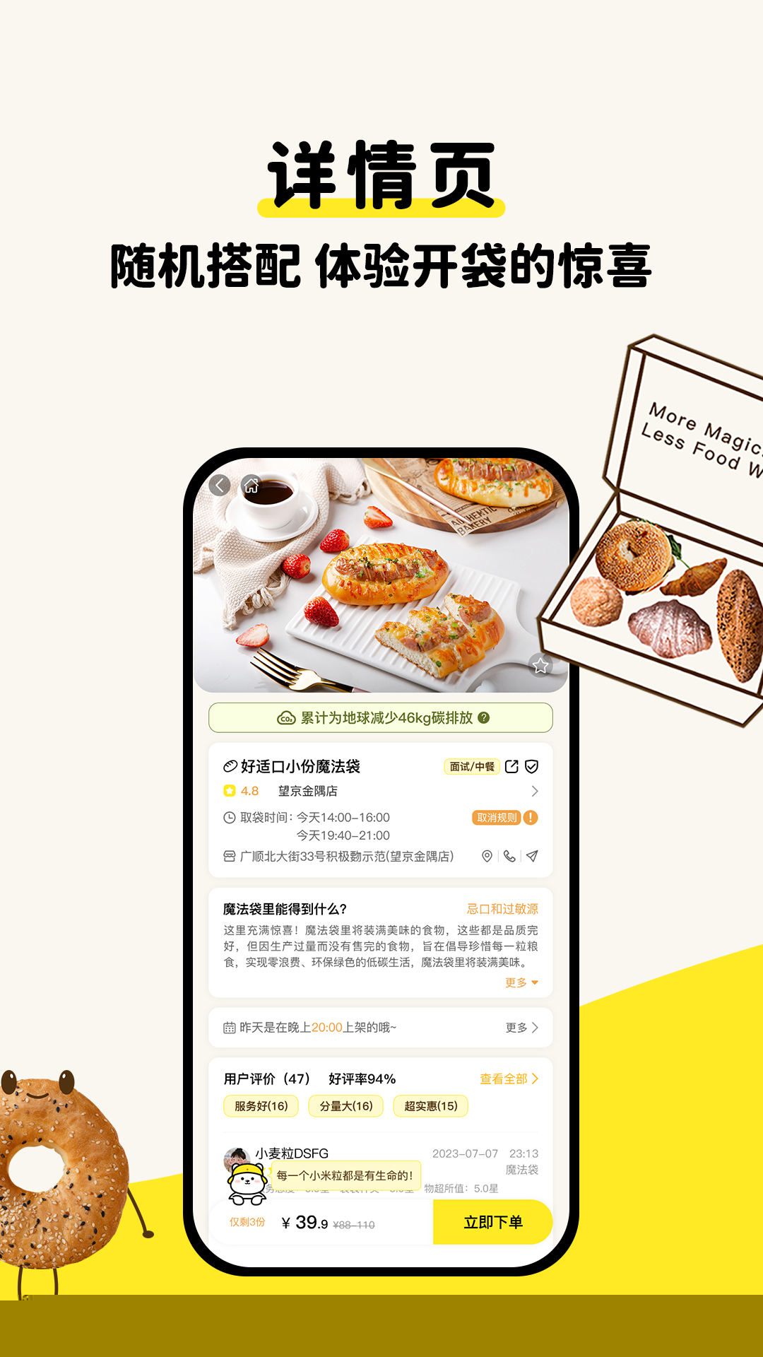 3. **实时更新**:惜食魔法袋会实时更新商家的余量食物信息,确保用户能够第一时间了解最新的可用食物,避免错过美味与优惠。