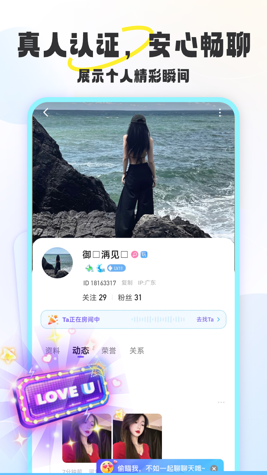 1. 语音聊天室:伴糖星球的语音聊天室汇聚了大量高颜值达人实时在线陪伴,用户可以在这里进行聊天、点唱和参加各种多样的派对。聊天室的氛围热烈,欢乐不断,用户可以和朋友们一起享受愉快的时光,随时随地与他人互动。