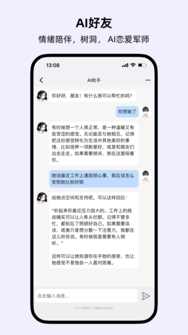 3. 多模态情感陪伴与疏导:除了辅助用户与他人沟通,蜜应还关注用户自身的情感健康。软件内置独立的情感陪伴模式。在此模式下,AI将扮演一个知心好友或倾听者的角色。用户可以随时开启一段私密对话,倾诉日常压力、分享快乐烦恼、或探讨情感困惑。AI会基于情感计算模型给予共情式回应、积极心理疏导以及建设性的视角建议。这一功能对于那些在陌生城市打拼、偶尔感到孤独,或暂时不想打扰朋友但又需要情绪出口的用户而言,提供了一个安全、便捷的陪伴空间。