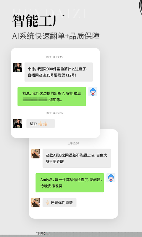 4. 全链路数字化管理与赋能:解决服装零售商在采购、销售、供应链协同中信息不对称、效率低下的问题。黑袋子App作为一个集成平台,将源头供货、柔性生产、一件代发物流、数据洞察等功能融为一体。用户不仅可以便捷选品采购,还能通过平台的数据反馈了解潮流趋势,优化自己的货盘结构。这种全链路的数字化赋能,帮助用户从凭经验选货转向靠数据决策,提升整体经营效率和盈利能力。