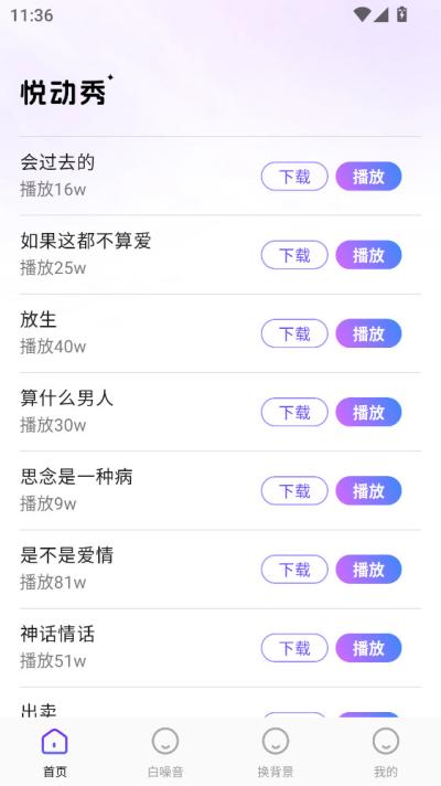 3. 沉浸式白噪音与睡眠辅助:针对用户在学习、工作、休息时对专注或放松的环境音需求,悦动秀专门开辟了白噪音功能板块。这里汇集了雨声、海浪、森林、篝火、咖啡馆背景音等多种高质量的环境音效。用户不仅可以播放试听,还可以将其设置为定时关闭的睡眠伴侣或专注背景音,帮助缓解压力、提升注意力或促进睡眠,拓展了应用 beyond 单纯铃声工具的使用场景。