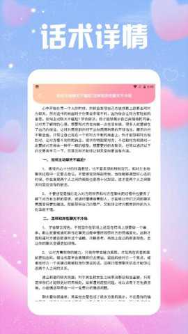 1. 场景化话术学习与情商提升: 针对用户在不同社交场景下的沟通困境,软件提供了极其详尽的话术分类与解析。用户可以随时在线学习如何应对各种提问,掌握高情商的回复技巧。无论是初次破冰、深入聊天,还是化解尴尬、表达关心,都能找到对应的实战案例和话术模板。详细的话术讲解帮助用户不仅知其然,更知其然,从而真正内化为自己的沟通能力,显著提升聊天水平与情感认知。