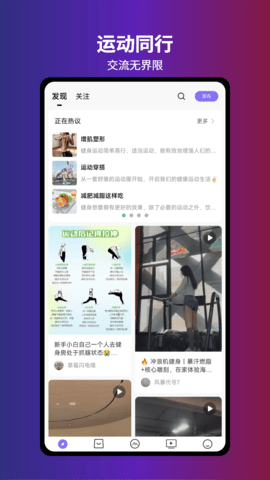 快速上手指南: 1. 初始化与目标设定: 首次启动后,跟随引导完成身高、体重等基本信息填写,并明确设定你的首要运动目标(如减脂、增肌、提升耐力或备战特定赛事)。 2. 开启首次运动记录: 在主界面点击开始运动,选择运动类型(如户外跑、室内骑行),户外运动可启用GPS绘制精美轨迹图,室内训练则直接进入计时与计数模式。 3. 跟随课程进行系统训练: 进入课程板块,根据自身水平和兴趣筛选计划,训练中界面会实时显示当前动作的剩余时间、次数和下一动作预览,语音指导全程相伴。 4. 数据回顾与深度分析: 运动结束后,在历史或数据中心查看本次训练的详细摘要报告,并对比历史数据,重点关注关键指标的变化趋势。 5. 参与社区挑战保持活力: 定期浏览挑战或社区栏目,加入如月度跑量挑战、假日骑行活动等,与全国跑友同台竞技,完成挑战可获得专属虚拟荣誉,让运动不再孤单。