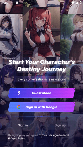便捷的启动与个性化设置流程: 用户可以通过谷歌账户快速登录或邮箱注册,流程简洁。登录后,直观的角色创建向导会引导用户一步步完成从外观到性格的全面设定,让创造专属伙伴的过程本身就成为一段有趣的体验,从而快速建立起与应用的情感连接,顺利开启独特的陪伴之旅。